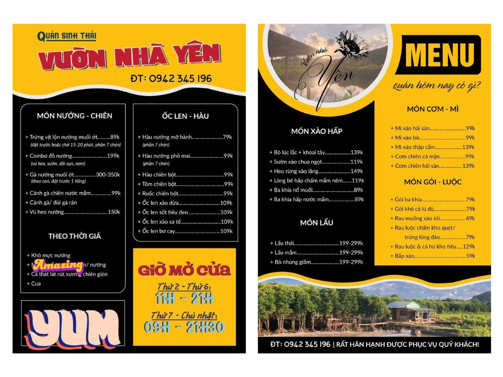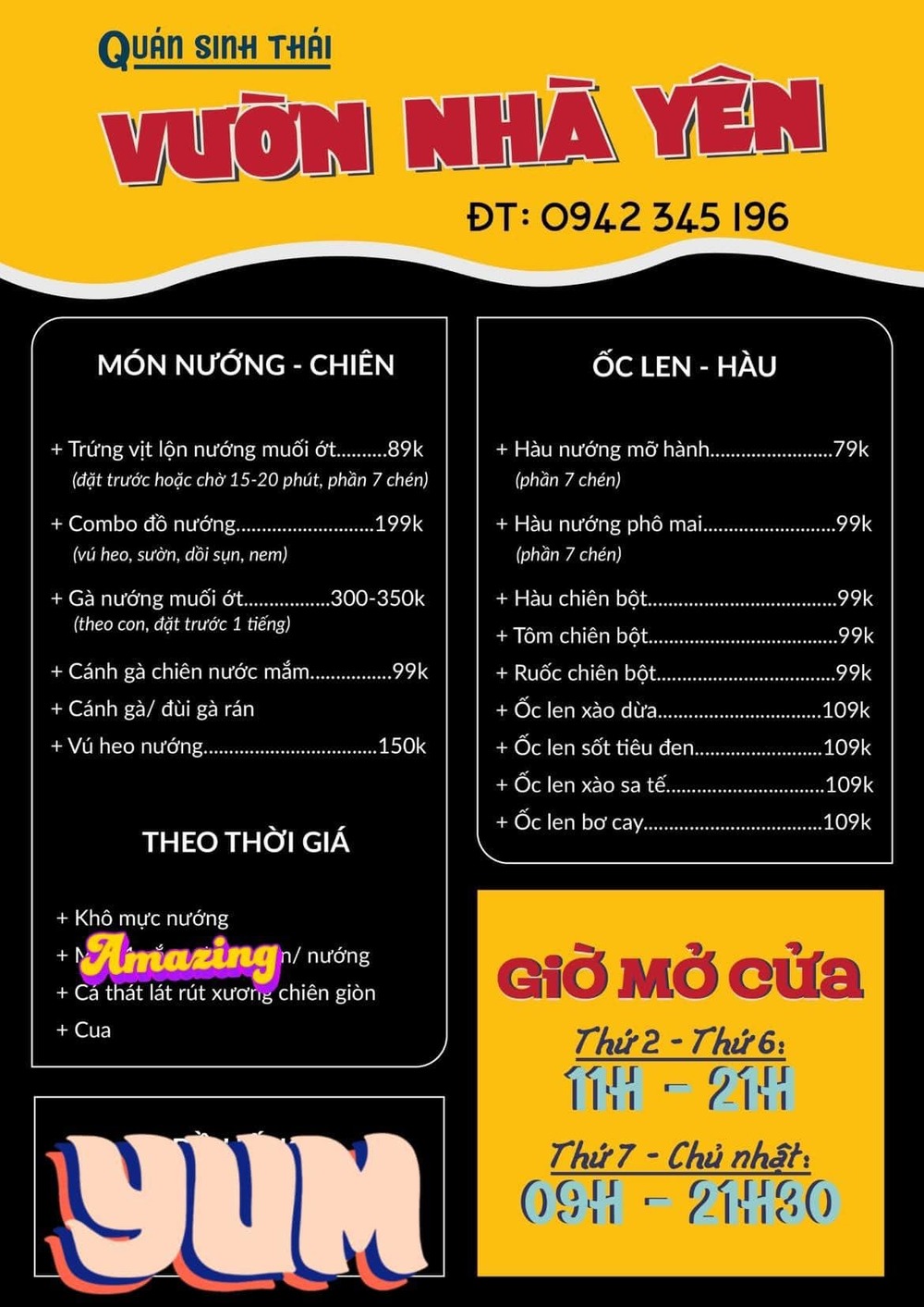 Các món ăn của quán rất đa dạng và thay đổi mỗi ngày, nếu có cơ hội đến hãy nếm thử vị ngon trong miệng từ những nguyên liệu được lựa chọn chất lượng. Quán sẽ phục vụ các món ăn khi được đặt trước để không khiến thực khách thân yêu phải chờ đợi lâu, thực khách chỉ việc đến và thưởng thức những món ăn thơm ngon, nóng hổi được Vườn Nhà Yên tậm tâm phục vụ.