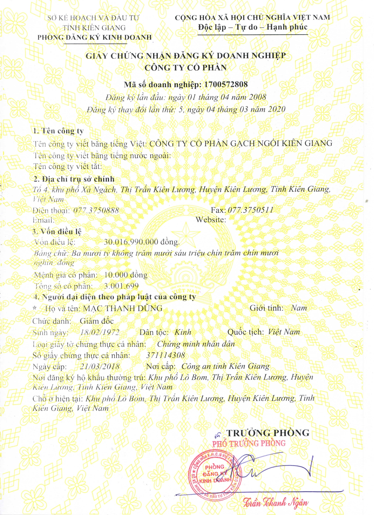 Giấy chứng nhận ĐKKD: Số 1700572808 do Sở Kế Hoạch và Đầu Tư Tỉnh Kiên Giang cấp, đăng ký lần đầu ngày 01/04/2008, đăng ký thay đổi lần 6 ngày 16 tháng 11 năm 2021.