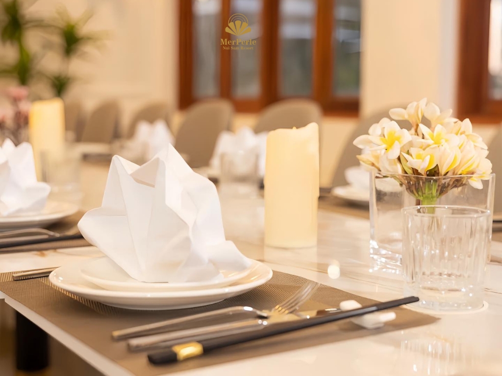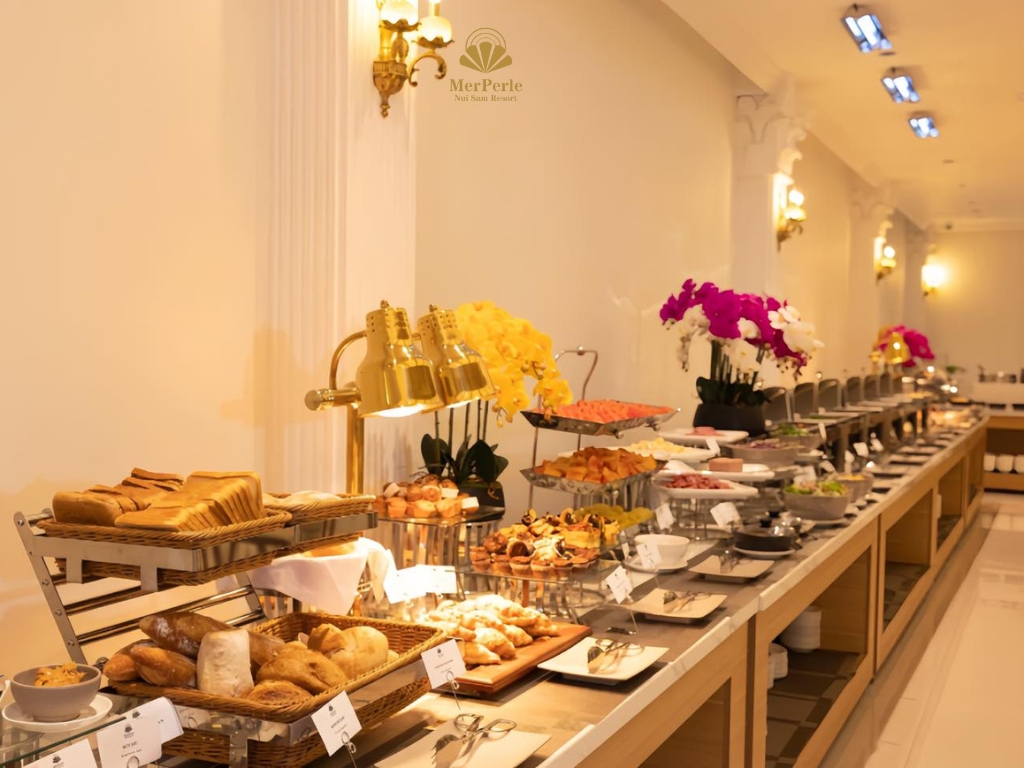 Đội ngũ đầu bếp MerPerle Núi Sam Resort chuyên nghiệp, và thực đơn phong phú, hòa quyện giữa ẩm thực truyền thống và hiện đại, từ các món đặc sản địa phương đến các món Âu-Á đặc sắc.