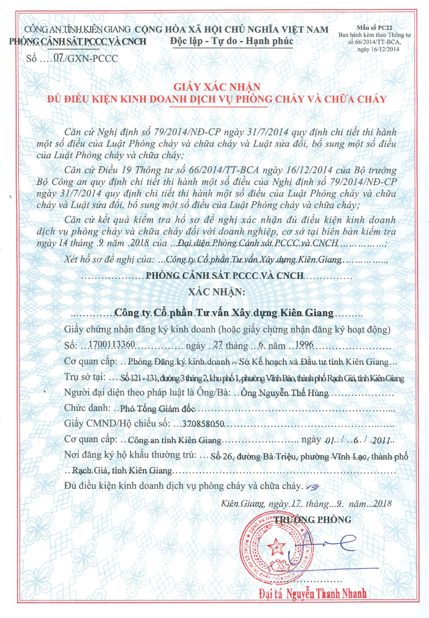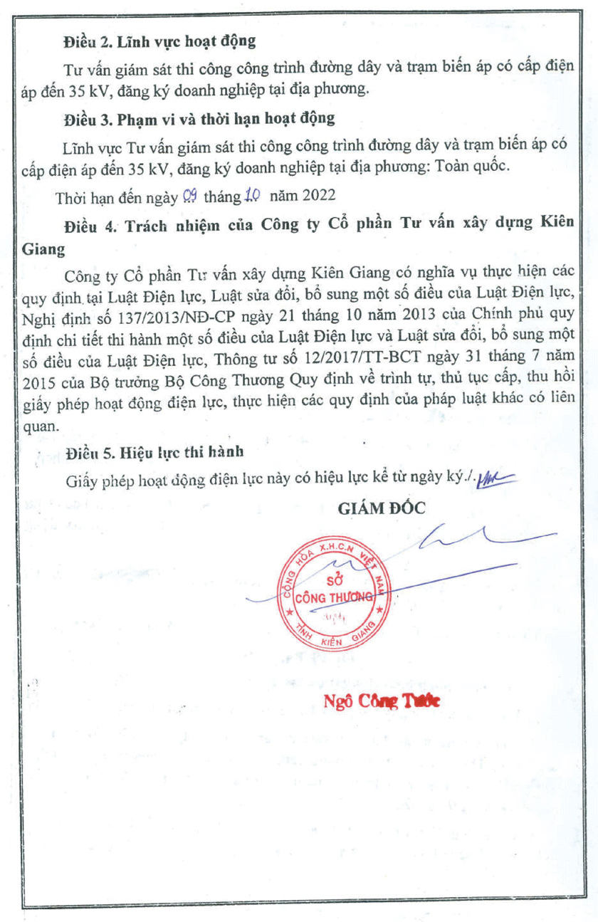 Ngày 1561996 Chủ tịch UBND tỉnh ký Giấy phép thành lập công ty cổ phần số 003347 GPTLDN03 với các nội dung Tên công ty CÔNG TY CỔ PHẦN TƯ VẤN XÂY DỰNG KIÊN GIANG Trụ sở số 19C Minh Mạng phường Vĩnh Thanh Vân thị xã Rạch Giá tỉnh Kiên Giang