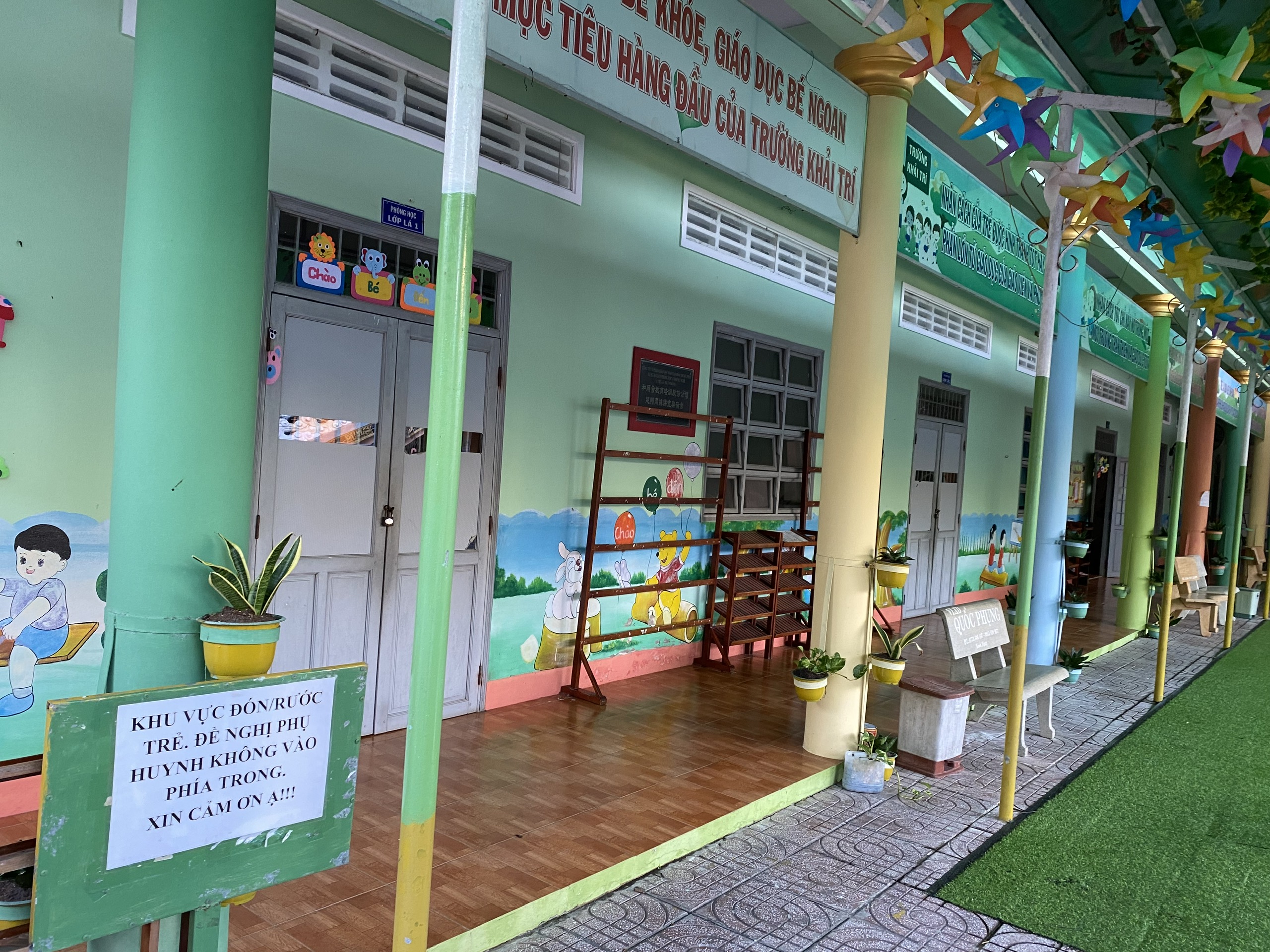 Lớp học được trang bị Smart TV, máy lạnh, quạt máy, đồ dùng đồ chơi đầy đủ theo tiêu chuẩn của bộ GD-ĐT.