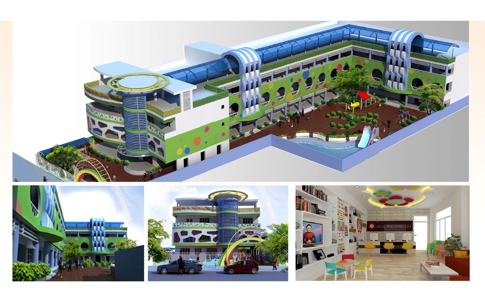 Trường mầm non Hoa Phượng Đỏ được xây dựng mới hoàn toàn, thiết kế theo tiêu chuẩn kiến trúc hiện đại với phong cách tươi sáng, yên tĩnh và trồng nhiều cây xanh.
