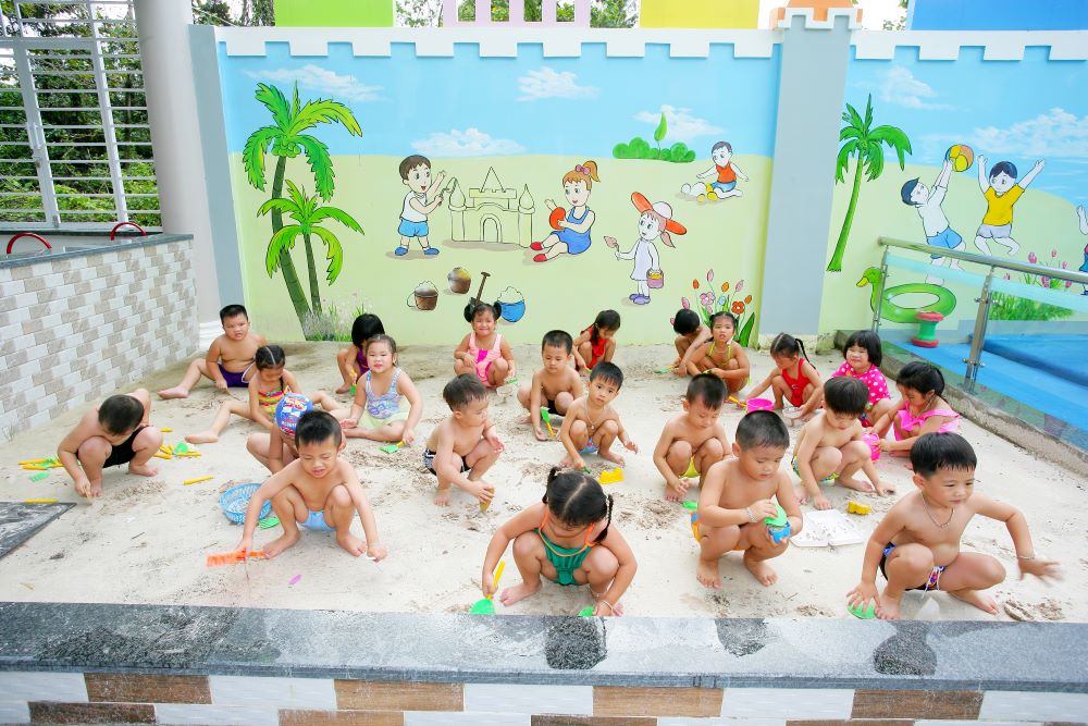 Sân chơi ngoài trời có cây che bóng mát, đảm bảo môi trường xanh, sạch, đẹp; được trang bị nhiều đồ chơi lớn với các chủng loại như khu cầu tuột liên hoàn, nhà chui hình khối, nhà banh bóng rổ, bể chơi nước, chơi cát…Đặc biệt có hệ thống đồi cỏ trải dài bao quanh sân trường cho trẻ học trồng cây.