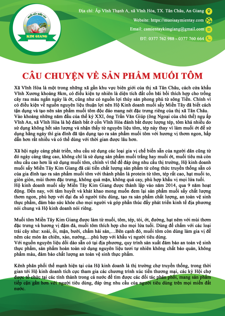 Xã hội ngày càng phát triển, nhu cầu sử dụng các loại gia vị chế biến sẵn của người dân cũng từ đó ngày càng tăng cao, không chỉ là sử dụng sản phẩm muối trắng hay muối ớt, muối tiêu mà còn nhu cầu cao hơn là sử dụng muối tôm, chính vì thế để đáp ứng nhu cầu thị trường, Hộ kinh doanh muối sấy Miền Tây Kim Giang đã cải tiến chất lượng sản phẩm từ công thức truyền thống sẵn có của gia đình tạo ra sản phẩm muối tôm với thành phần là protein từ tôm, tép rất cao, hạt muối to, giòn giòn, mùi thơm đặc trưng, không quá mặn, không quá cay, phù hợp khẩu vị mọi lứa tuổi.