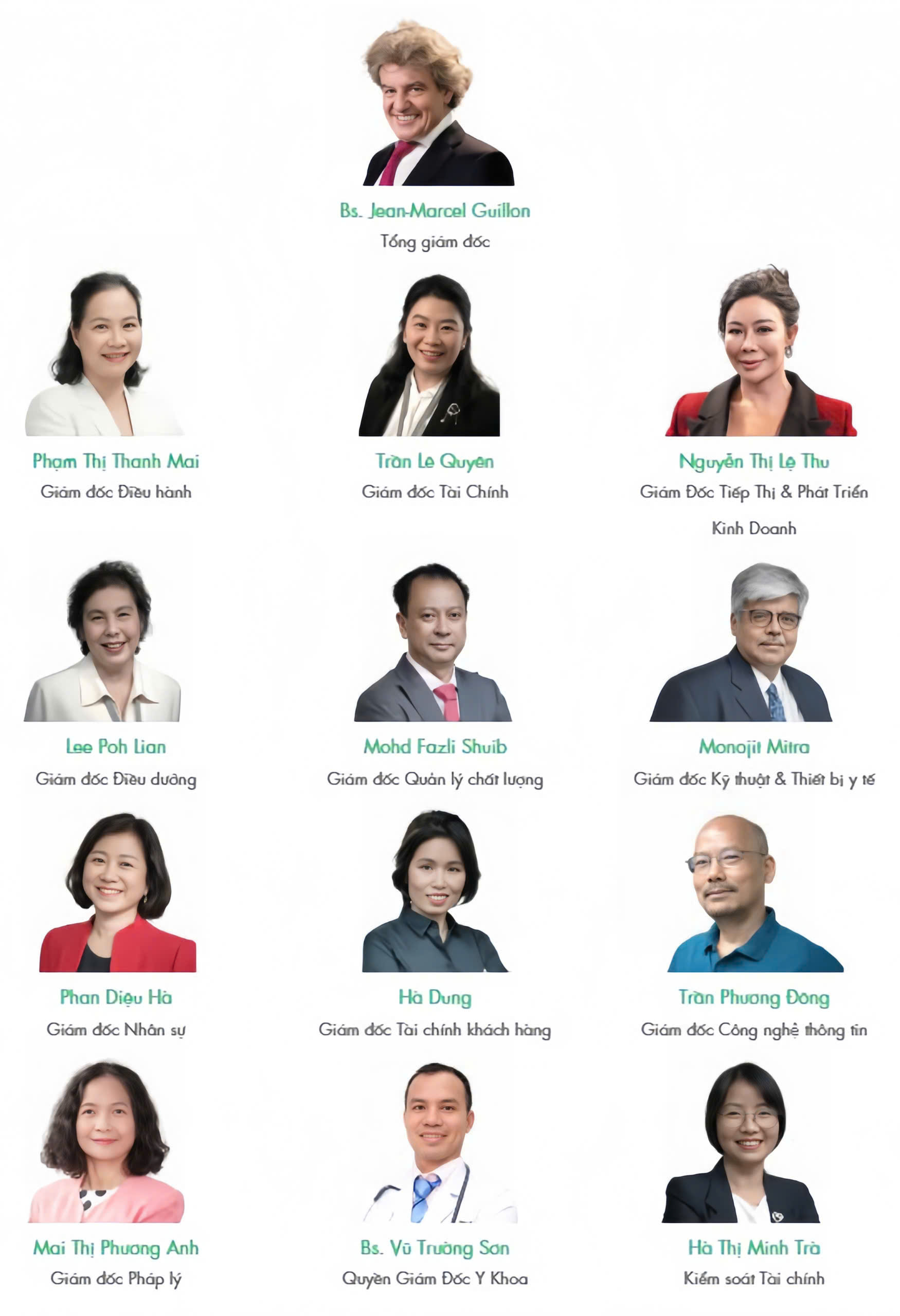 Đội ngũ lãnh đạo đóng vai trò quan trọng trong việc dẫn dắt bệnh viện hướng đến dịch vụ chăm sóc sức khỏe theo tiêu chuẩn quốc tế. Là những người đứng đầu tại một bệnh viện quốc tế, Ban giám đốc FV gồm nhiều cá nhân có kinh nghiệm lâu năm trong lĩnh vực quản trị bệnh viện. Với đội ngũ nhân sự đa quốc tịch, các lãnh đạo FV cùng chia sẻ chuyên môn quản lý trong ngành chăm sóc sức khỏe, mang lại sự sáng tạo, hiệu quả và cam kết chăm sóc bệnh nhân tốt hơn.