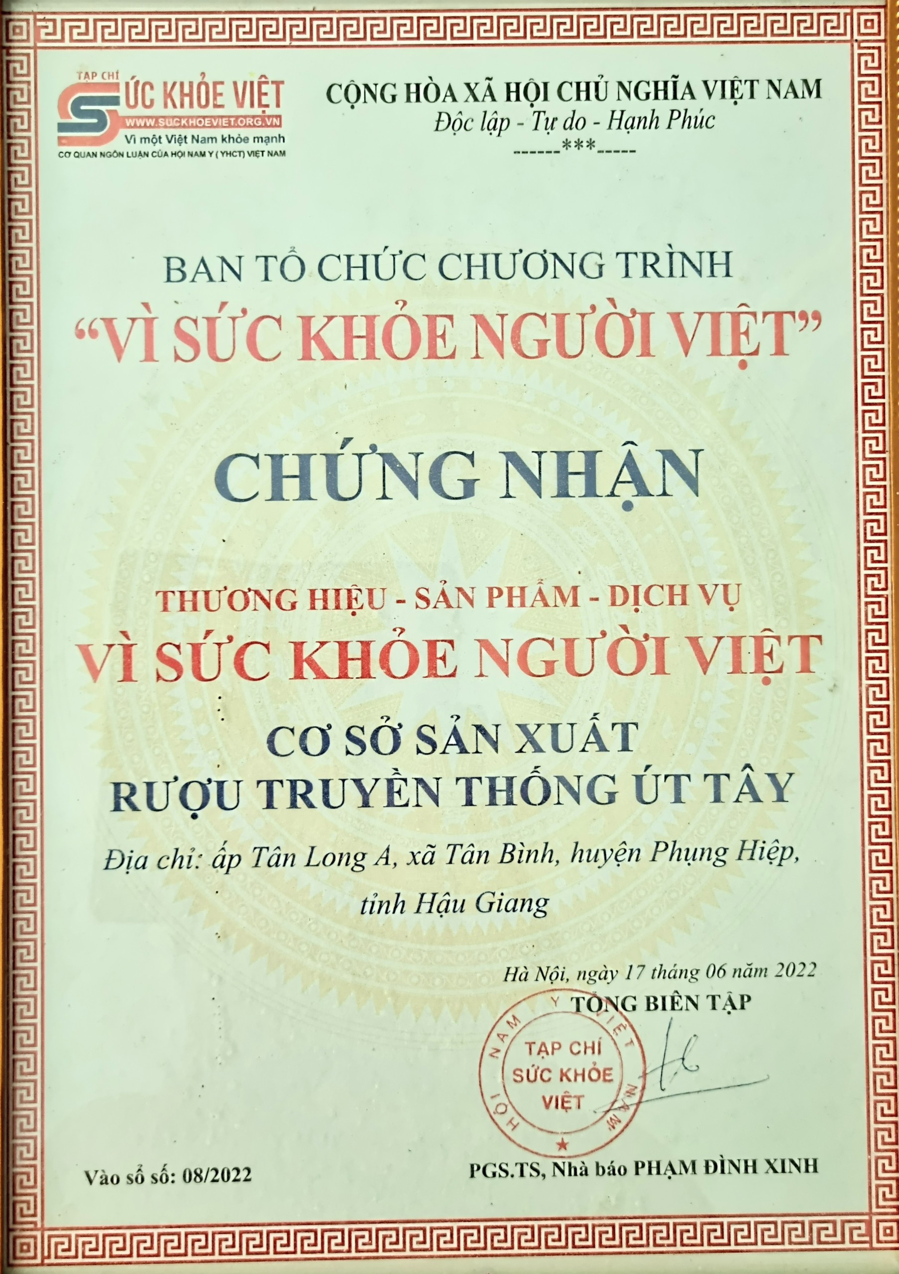 Cơ sở sản xuất rượu thủ công truyền thống Út Tây gần đây đã được biết đến với những sản phẩm rượu được chứng nhận sản phẩm OCOP 4 sao trong năm 2020, cũng như chứng nhận sản phẩm công nghiệp nông thôn tiêu biểu Hậu Giang năm 2021