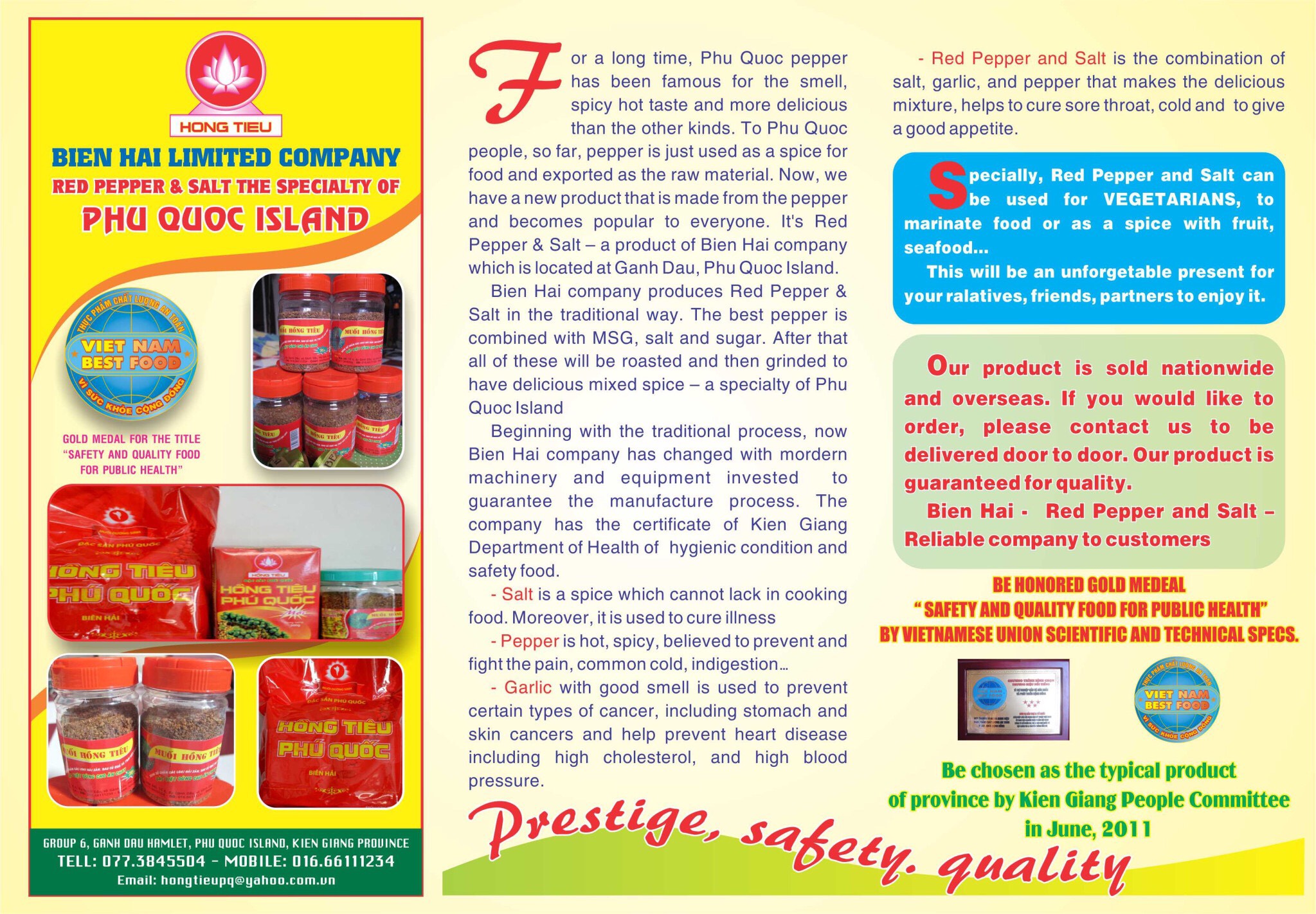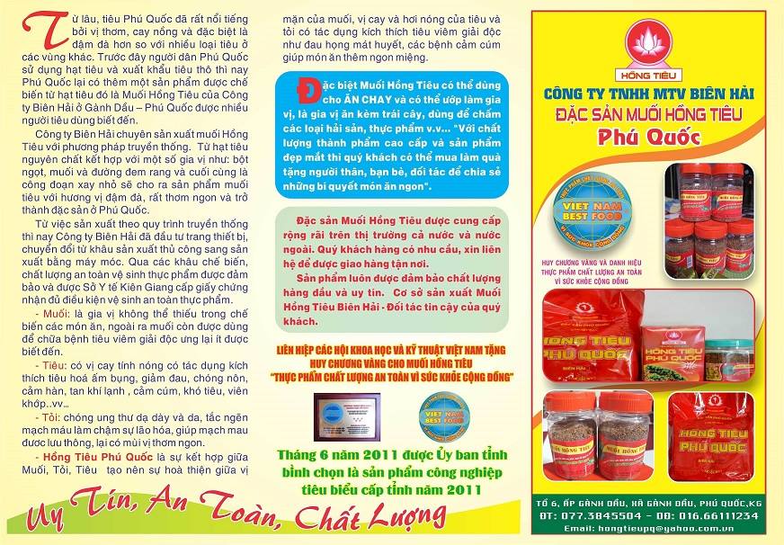 Từ lâu, Tiêu Phú Quốc đã rất nổi tiếng bởi vị thơm, cay nồng và đặc biệt là đậm đà hơn so với nhiều loại tiêu ở các vùng khác. Trước đây người dân Phú Quốc sử dụng hạt tiêu và xuất khẩu tiêu thô thì nay Phú Quốc đã có Muối Hồng Tiêu Phú Quốc Biên Hải được chế biến từ hạt tiêu Phú Quốc.